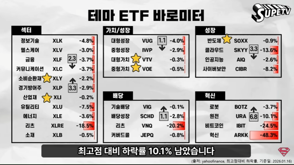 - (+): AMD, MSTR, WMT, TSM, SNDK, MU, 코어위브, 아이렌, 로켓랩